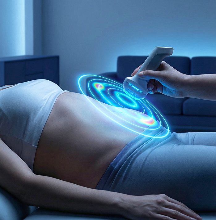 فحص السونار باستخدام الموجات الصوتية لتصوير الأعضاء الداخلية بدقة عالية، مما يتيح تشخيصًا سريعًا وموثوقًا ومتابعة طبية مريحة داخل المنزل.