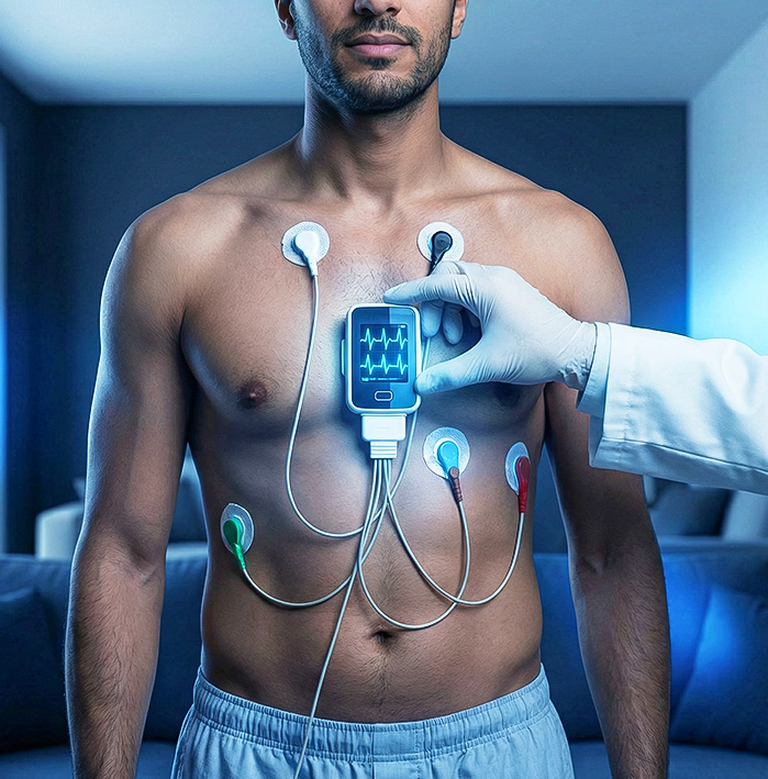 فحص متخصص لتسجيل نشاط القلب بدقة باستخدام أجهزة طبية معتمدة داخل المنزل، للمساعدة في التشخيص والمتابعة الطبية بكفاءة عالية.